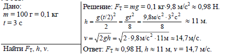 Брошенный вертикально вверх мяч массой 100 г вернулся на Землю через 3 с. Определите скорость мяча, силу тяжести, действующую на мяч, и высоту, на которую он поднялся