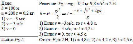 С вертолета, находящегося на высоте 100 м над Землей, упал предмет массой 200 г. Чему равна сила тяжести, действующая на предмет? Через сколько времени предмет достигнет поверхности Земли, если вертолет поднимается со скоростью 3 м/с; опускается со скоростью 3 м/с; неподвижен относительно Земли