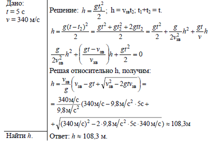 Камень упал в воду с крутой скалы. Звук его падения был услышан на вершине скалы через 5 с. Определите высоту скалы, если скорость звука в воздухе равна 340 м/с