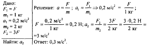 Некоторая сила F сообщает телу массой 1 кг ускорение, равное 0,2 м/с2. С каким ускорением будет двигаться тело массой 2 кг под действием силы, равной 3 F
