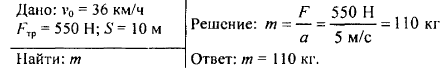 Мотоциклист, ехавший со скоростью 36 км/ч, резко затормозил. Сила трения составила 550 Н на тормозном пути 10 м. Определите ускорение и напишите уравнение скорости мотоциклиста в зависимости от времени