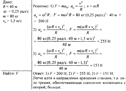Представим, что для создания искусственной силы тяжести космическая станция изготовлена в форме полого колеса радиусом 40 м, вращающегося со скоростью 0,25 рад/с. Определите силу, действующую на космонавта массой 80 кг, если космонавт: 1) неподвижен; 2) идет внутри станции в направлении ее вращения со скоростью 1,3 м/с; 3) идет с той же скоростью в противоположном направлении. В каком из направлений легче идти