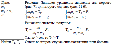 Два связанных невесомой нерастяжимой нитью тела массами m1 и m2>m1 лежат на гладком столе. Силу F прикладывают сначала к телу большей массы (рис. 71, а), а затем к телу меньшей массы (рис. 71, б). Одинакова ли сила натяжения нити