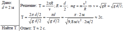 Ведерко с водой вращается в вертикальной плоскости по окружности диаметром 2 м. При каком максимальном периоде обращения вода из ведерка не выливается