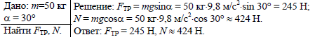 На наклонной плоскости, образующей угол 30° с горизонтом, покоится тело массой 50 кг. Определите значения силы трения покоя и силы нормальной реакции опоры