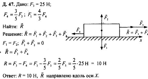 По условию задачи Д. 46 определите направление и модуль равнодействующей сил, представленных на рисунке 7д. На рисунке 7д с помощью векторов изображены четыре силы, действующие на тело. Модуль вектора силы F3 соответствует силе, равной 25 Н. Чему равны силы F1, F2, F4, если F4=3/5 F3, a F1= 4/3 F4? Назовите силы, действующие на тело