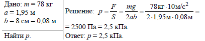 Спортсмен, масса которого 78 кг, стоит на лыжах. Длина каждой лыжи 1,95 м, ширина 8 см. Какое давление оказывает спортсмен на снег