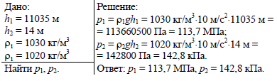 Рассчитайте давление воды: а) на самой большой глубине Тихого океана — 11 035 м; б) на наибольшей глубине Азовского моря — 14 м (плотность воды в нем принять равной 1020 кг/м3)