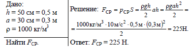 F = ρghlh/2 = 1000 * 9,8 * 0,3 * 0,5 * 0,3 / 2 = 220,5 Н