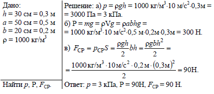В аквариум высотой 32 см, длиной 50 см и шириной 20 см налита вода, уровень которой ниже края на 2 см. Рассчитайте: а) давление воды на дно; б) вес воды; в) силу, с которой вода действует на стенку шириной 20 см