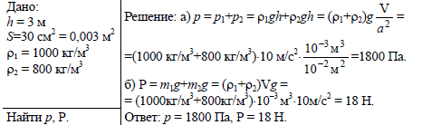 Прямоугольный сосуд вместимостью 2 л наполовину наполнен водой, а наполовину керосином. а) Каково давление жидкостей на дно сосуда? б) Чему равен вес жидкостей в сосуде? Дно сосуда имеет форму квадрата go стороной 10 см