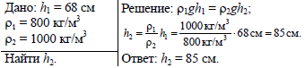 В сообщающихся сосудах находятся ртуть и вода (рис. 149). Высота столба воды 68 см. Какой высоты столб керосина следует налить в левое колено, чтобы ртуть установилась на одинаковом уровне