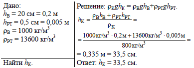 В сообщающихся сосудах находятся ртуть, вода и керосин (рис. 150). Какова высота слоя керосина, если высота столба воды равна 20 см и уровень ртути в правом колене ниже, чем в левом, на 0,5 см