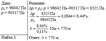 У подножия горы барометр показывает 98 642 Па, а на ее вершине — 90 317 Па. Используя эти данные, определите высоту горы