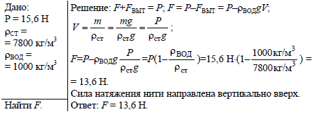 Стальной брусок, вес которого 15,6 Н, погрузили в воду (рис. 190). Определите значение и направление силы натяжения пружины