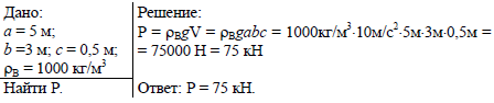 Прямоугольная баржа длиной 5 м и шириной 3 м после загрузки осела на 50 см. Определите вес груза, принятого баржей