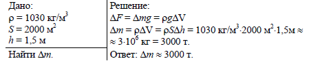 Площадь сечения теплохода на уровне воды равна 2000 м2. Сколько нужно добавить груза, чтобы теплоход погрузился в морской воде еще на 1,5 м, считая, что борта его на данном уровне вертикальны