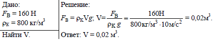 Было установлено, что при полном погружении куска меди в керосин вес его уменьшается на 160 Н. Каков объем этого куска меди