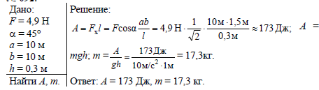 При чистке пылесосом напольного ковра человек, продвигаясь равномерно вперед, прикладывает силу 4,9 Н вдоль трубки пылесоса, которую держит под углом 45° к полу. Какую работу по преодолению трения надо совершить, чтобы очистить ковер в помещении шириной 1,5 м и длиной 10 м, если ширина щетки равна 30 см? Какой массы груз надо поднять на высоту 1 м, чтобы совершить такую же работу