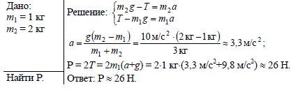 К пружинным весам (рис. 231) подвешен блок. Через блок перекинут нерастяжимый шнур, к концам которого привязаны грузы массами 1 и 2 кг. Какой вес будут регистрировать пружинные весы во время движения грузов? (Весом блока и шнура пренебречь.)