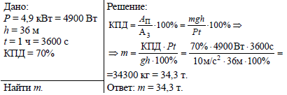 Сколько воды можно поднять из колодца глубиной 36 м в течение 1 ч, если мощность электродвигателя насоса равна 4,9 кВт, а КПД установки равен 70%