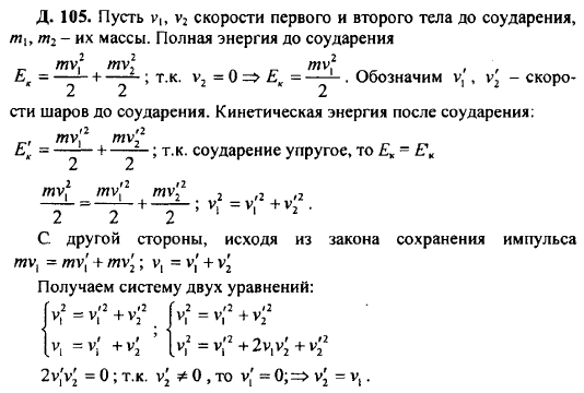 Обозначим скорость первого тела до удара v0, его скорость после удара v1, скорость второго тела после удара v2. Исходя из законов сохранения, придем к соотношениям v012 = v22+ v12 и v01= v2+ v1. Возведя в квадрат левую и правую части второго уравнения, сравним полученное уравнение с первым и убедимся в том, что v2v1=0. Поскольку v2≠0, следовательно, v1 = 0. Тогда v2=v01, и поэтому кинетическая энергия первого тела полностью перешла ко второму.