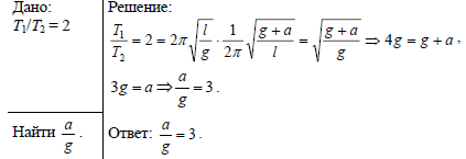 В покоящейся ракете колеблется математический маятник. При движении ракеты вверх с некоторым ускорением период колебания маятника уменьшился вдвое. Во сколько раз ускорение, с которым движется ракета, больше ускорения свободного падения