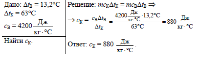 На нагревание кирпича массой 4 кг на 63 °С затрачено такое же количество теплоты, как и на нагревание воды той же массы на 13,2 °С. Определите удельную теплоемкость кирпича