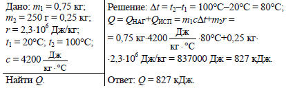Сколько энергии израсходовано на нагревание воды массой 0,75 кг от 20 до 100 °С и последующее образование пара массой 250 г