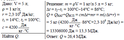 Какое количество теплоты потребовалось для получения дистиллированной воды объемом 5 л, если вода в дистиллятор поступила при температуре 14 °С? (Потерями энергии пренебречь.)