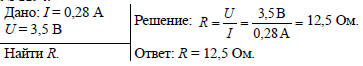 Вычислите сопротивление спирали лампы от карманного фонаря, если при напряжении 3,5 В сила тока в ней 0,28 А