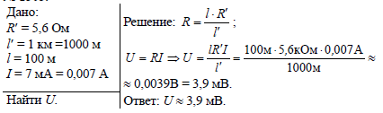 Сопротивление проволоки длиной 1 км равно 5,6 Ом. Определите напряжение на каждом участке проволоки длиной 100 м, если сила тока в ней 7 мА