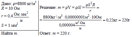 Какой массы надо взять никелиновый проводник площадью поперечного сечения 1 мм2, чтобы из него изготовить реостат сопротивлением 10 Ом? (Плотность никелина 8,8 г/см3.)