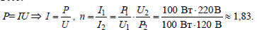 На баллоне первой лампы написано 120 В; 100 Вт, а на баллоне второй — 220 В; 100 Вт. Лампы включены в сеть с напряжением, на которое они рассчитаны. У какой лампы сила тока больше; во сколько раз