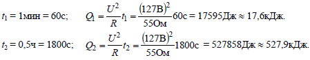 Проволочная спираль, сопротивление которой в нагретом состоянии равно 55 Ом, включена в сеть напряжением 127 В. Какое количество теплоты выделяет эта спираль за 1 мин; за 0,5 ч