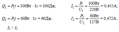 На баллоне одной электрической лампы написано 100 Вт; 220 В, а другой — 60 Вт; 127 В. Какое количество теплоты выделяет каждая лампа ежесекундно, будучи включенной в сеть напряжением, на которое она рассчитана? Сравните силу тока в лампах