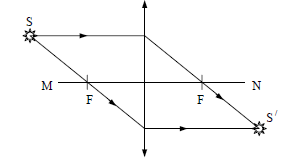 На рисунке 415 показан ход двух лучей, падающих на тонкую линзу с фокусным расстоянием F из светящейся точки S. Начертите дальнейший ход этих лучей и найдите положение изображения (S') источника света S