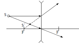 На рисунке 416 показан ход светового луча, падающего на рассеивающую линзу. Выполнив необходимое построение, найдите положение главного фокуса линзы и положение изображения (S') светящейся точки S. Какое это изображение: действительное или мнимое