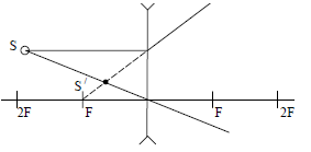 Выполнив построение, найдите положение изображения светящейся точки S в рассеивающей линзе L (рис. 421), где F — фокусное расстояние линзы