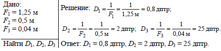 Фокусные расстояния трех линз соответственно равны 1,25 м; 0,5 м; 0,04 м. Какова оптическая сила каждой линзы