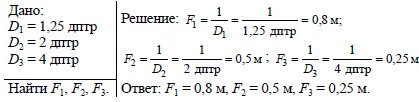 Оптическая сила линз у очков соответственно равна 1,25 дптр, 2 дптр и 4 дптр. Каковы фокусные расстояния таких линз