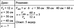 Объем ведра 12 л. Сколько ведер вмещает аквариум, длина которого 30 см, ширина 50 см и высота 40 см