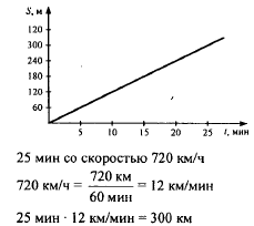 Начертите график движения самолета, который летит в течение 25 мин со скоростью 720 км/ч. Масштаб для оси времени: 5 мин — 1 см; масштаб для оси пройденного пути выберите самостоятельно