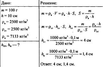 В мензурку налито 100 г воды. Высота столба воды 10 см. Какой высоты будут такой же массы и диаметра столбики из стекла и цинка