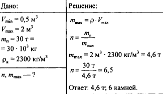 При бетонировании плотины гидроэлектрической станции там, где позволяли условия, укладывали «изюм» — отдельные большие камни объемом от 0,5 до 2 м3. «Изюм» доставлялся к месту укладки на железнодорожных платформах, с которых снимался и укладывался на месте при помощи кранов. Определите максимальную массу каждого такого камня и сколько их можно положить на одну платформу. (Максимальная нагрузка платформы не более 30 т.)