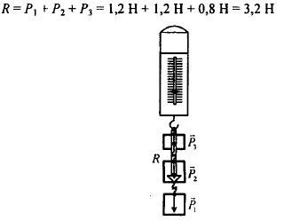 К динамометру подвешены три коробочки. Вес двух по 1,2 Н, а вес третьей — 0,8 Н. Каким должен быть вес груза, которым можно заменить эти три коробочки, чтобы указатель динамометра при этом установился на том же делении шкалы? Определите равнодействующую сил. Изобразите силы и равнодействующую сил графически
