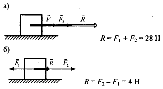 На тело действуют две силы: 12 Н и 16 Н. Найдите величину равнодействующей, если силы действуют: а) в одном направлении; б) противоположно друг другу. Дайте графический рисунок
