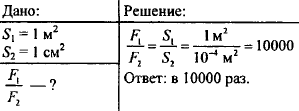 Площадь большого поршня 1 м2, а площадь малого 1 см2. Во сколько раз сила давления на большой поршень больше силы давления на малый, если поршни находятся в равновесии