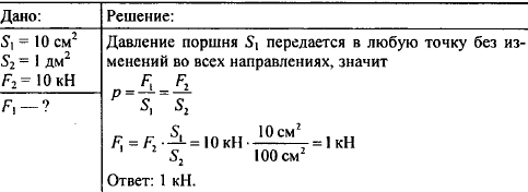 Горизонтально расположенная и наполненная водой труба (рис. 31) в своей широкой части имеет площадь поперечного сечения S2 = 1 дм2, а в узком S1 = 10 см2. Какой силой надо действовать на поршень Л, чтобы уравновесить силу 10 кН, действующую на поршень В