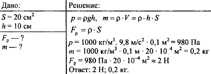 В сосуде, площадь дна которого 20 см3, налита вода до высоты 10 см. Определите силу давления, созданного только столбом воды, на дно сосуда. Какова масса налитой воды